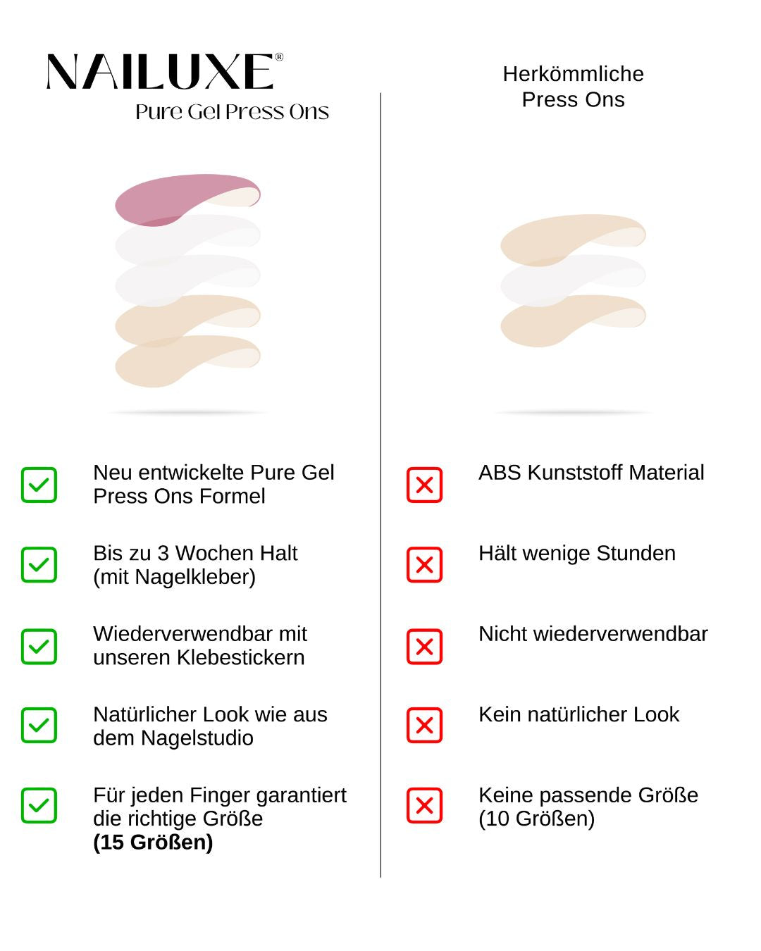 Während herkömmliche Press Ons aus einfachem Kunststoff bestehen und oft nicht richtig passen, bieten wir dir: